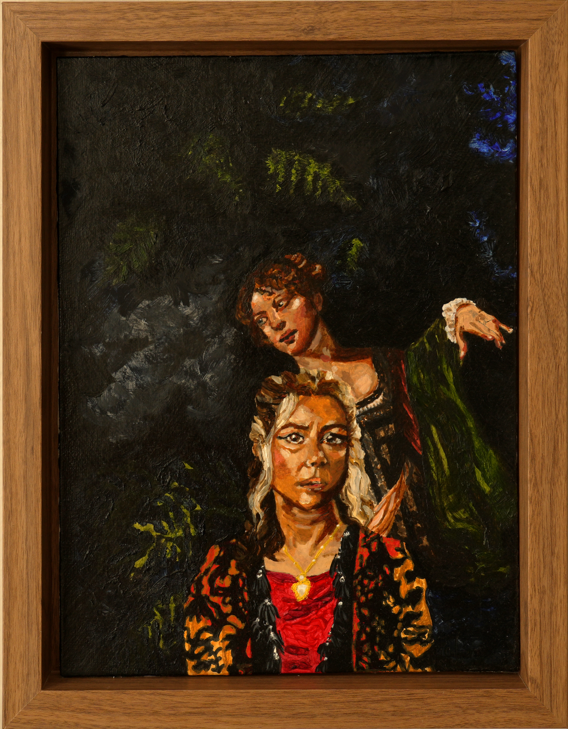 Cave Woman is a self-portrait that treats painting as a method of return. Unable to travel home, I practice “home” through time: I place myself inside Serra da Capivara, one of Brazil’s most ancient sites of rock imagery, and render my body with a near-bidimensional posture that echoes cave marks. My dog, who also migrated with me, stands as companion and witness, a portable form of shelter. Water figures, fish and crab, appear as memory-creatures: interior, tidal, persistent. The work imagines softness not as comfort, but as endurance, the way belonging is carried through gesture, repetition, and care when stability is conditional. Home becomes something enacted: an ancestral space I cannot physically reach, but can inhabit through mark-making.